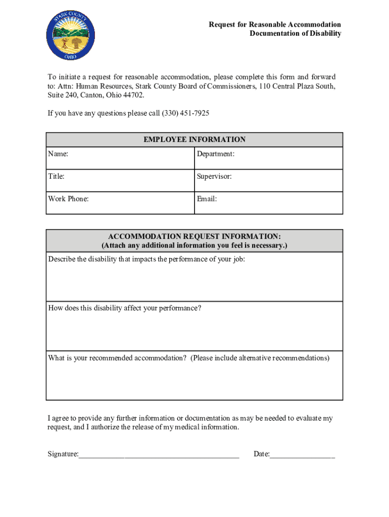 Request for Reasonable Accommodation Documentation of Disability initiate a request for reasonable accommodation, please complete this form and forward to: Attn: Human Resources, Stark County Board