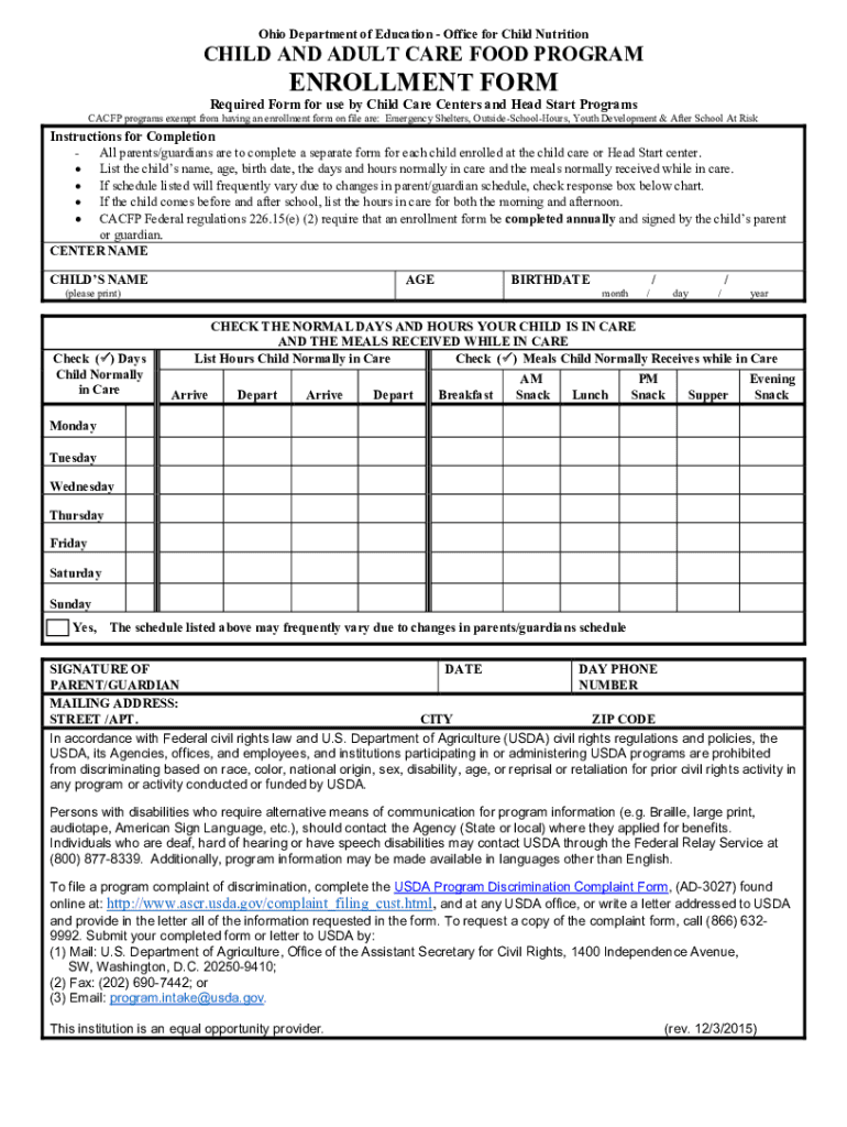 Ohio Department of Education Office for Child NutritionCHILD AND ADULT CARE FOOD PROGRAMENROLLMENT FORM Required Form for use by Child Care Centers and Head Start Programs CA CFP programs exempt from