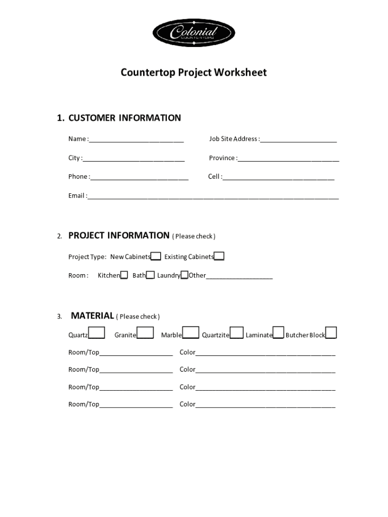 Countertop Project Worksheet1. CUSTOMER INFORMATION Name :___Job Site Address :___City :___Province :___Phone :___Cell :___Email :___2.PROJECT INFORMATION (Please check) Project Type: New Cabinets___