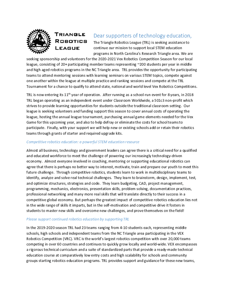 Dear supporters of technology education, The Triangle Robotics League (TRL) is seeking assistance to continue our mission to support local STEM education programs in North Carolina's Research Triangle