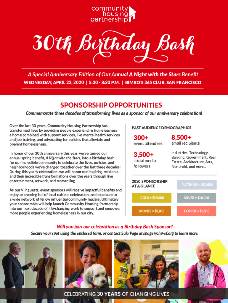 30th Birthday Bash A Special Anniversary Edition of Our Annual A Night with the Stars Benefit WEDNESDAY, APRIL 22, 2020 | 5:30 8:30 P.M. | BIMBO\'S 365 CLUB, SAN FRANCISCOSPONSORSHIP OPPORTUNITIES