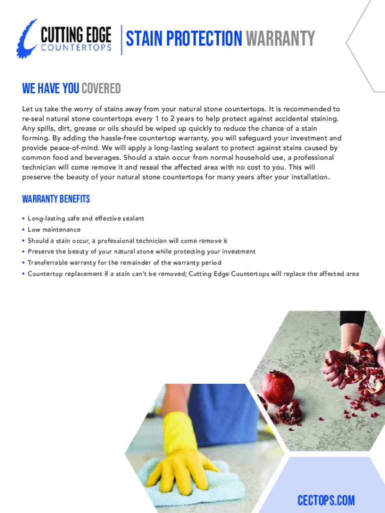 STAIN PROTECTION WARRANTY We have You covered Let us take the worry of stains away from your natural stone countertops. It is recommended to reseal natural stone countertops every 1 to 2 years to