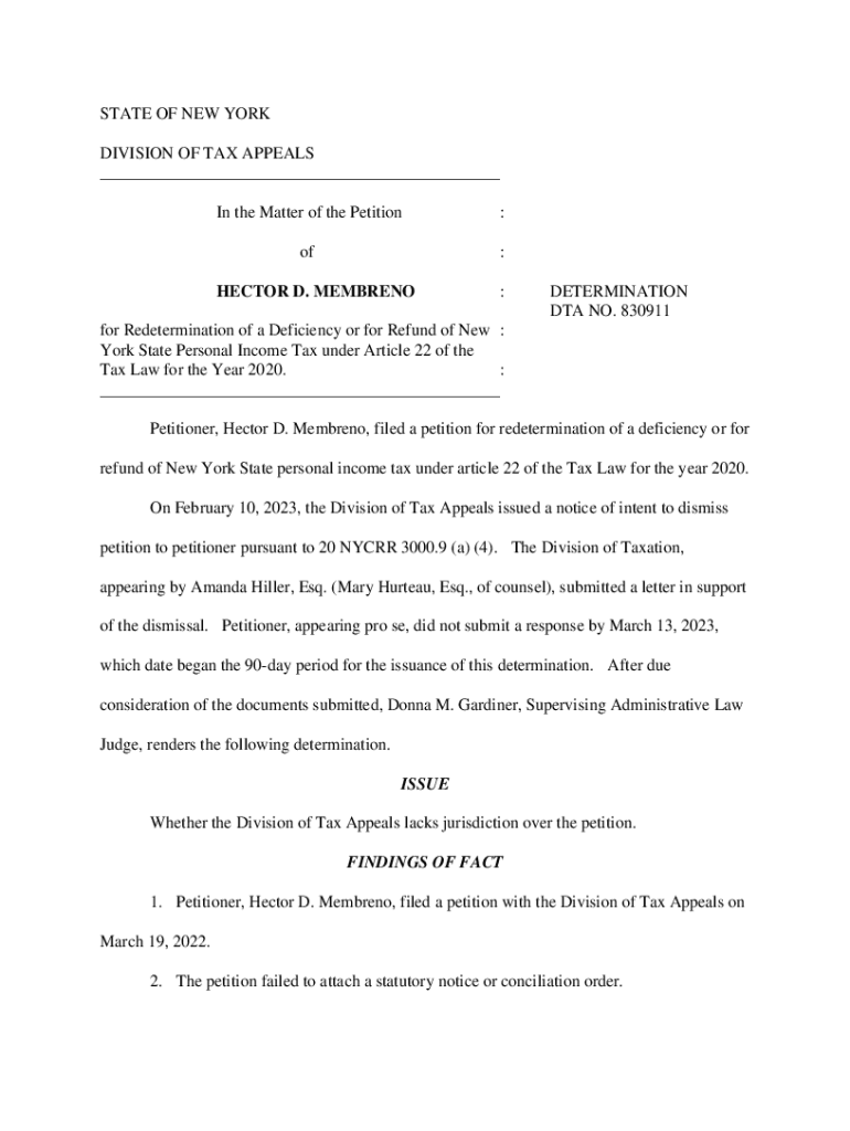 STATE OF NEW YORK DIVISION OF TAX APPEALS ___ In the Matter of the Petition:of:HECTOR D. MEMBRANE:DETERMINATION DTA NO. 830911for Redetermination of a Deficiency or for Refund of New : York State