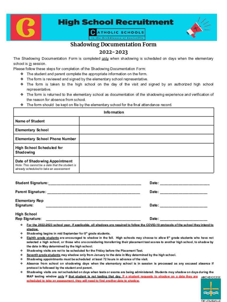 Information such as time spent shadowing, activities observed, and reflections on the experience must be reported on archdiocese of Louisville shadowing.