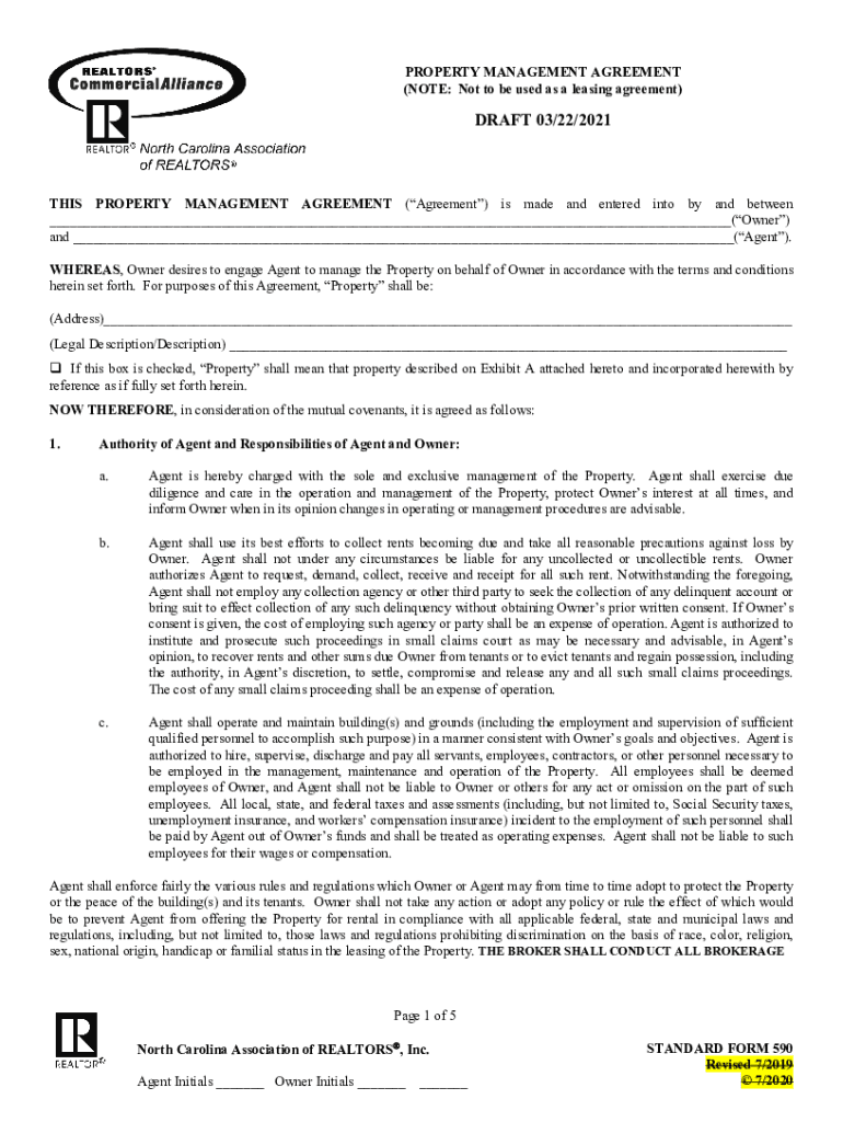 PROPERTY MANAGEMENT AGREEMENT (NOTE: Not to be used as a leasing agreement)DRAFT 03/22/2021THIS PROPERTY MANAGEMENT AGREEMENT (Agreement) is made and entered into by and between ___(Owner) and ___(Agent).