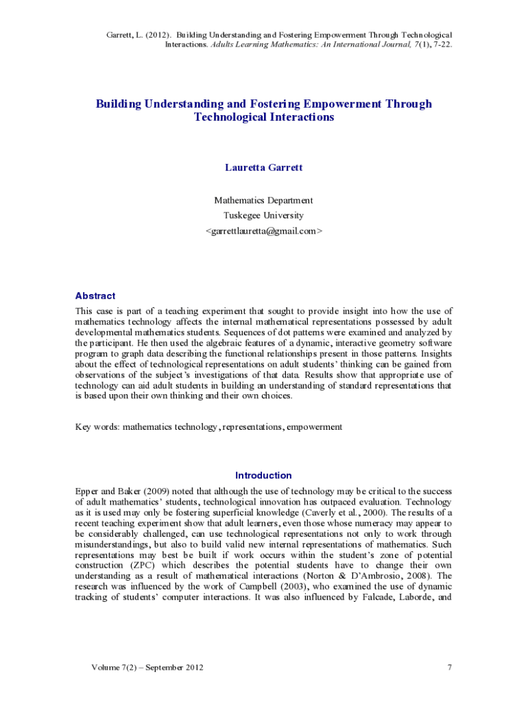 Garrett, L. (2012). Building Understanding and Fostering Empowerment Through Technological Interactions. Adults Learning Mathematics: An International Journal, 7(1), 722. Building Understanding and