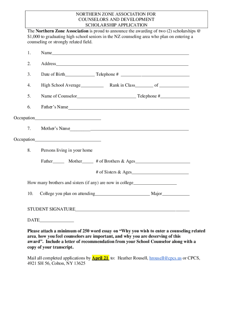 NORTHERN ZONE ASSOCIATION FOR COUNSELORS AND DEVELOPMENT SCHOLARSHIP APPLICATION The Northern Zone Association is proud to announce the awarding of two (2) scholarships @ $1,000 to graduating from