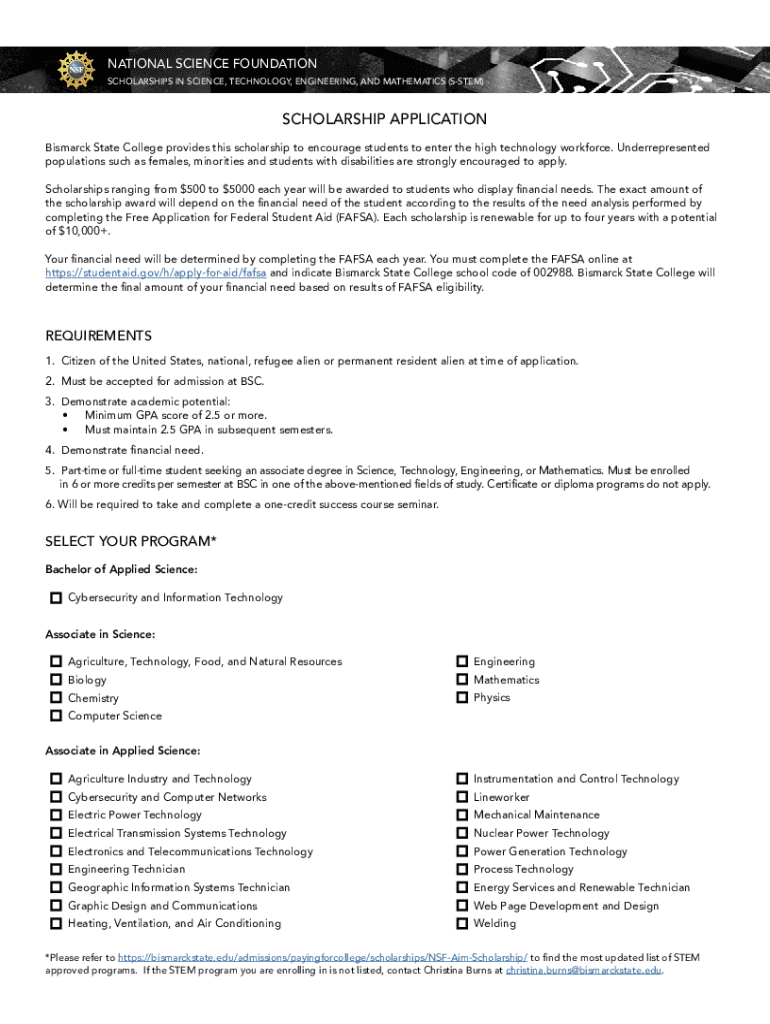 Students who are interested in pursuing STEM degrees at Bismarck State College are required to apply for the NSF AIM Scholarship.