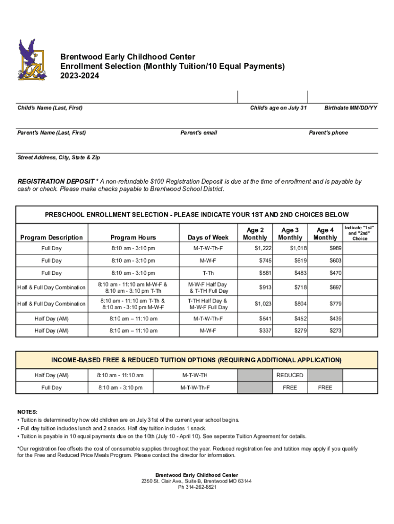 Obtain enrollment forms from Brentwood Early Childhood Center.