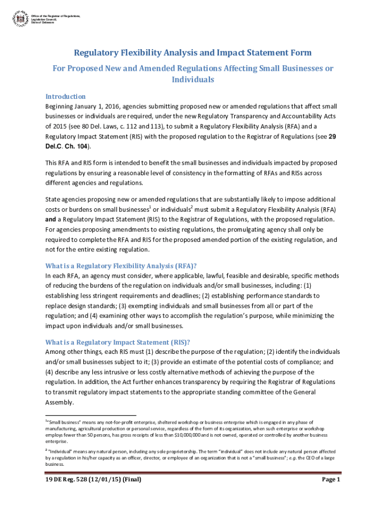 Office of the Registrar of Regulations, Legislative Council, State of DelawareRegulatory Flexibility Analysis and Impact Statement Form For Proposed New and Amended Regulations Affecting Small Businesses