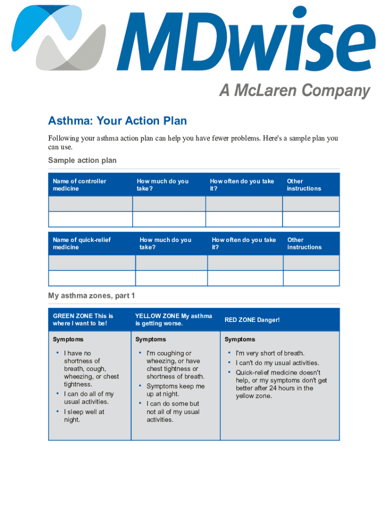 Asthma: Your Action Plan Following your asthma action plan can help you have fewer problems. Here\'s a sample plan you can use. Sample action plan Name of controller medicine much do you take? Name