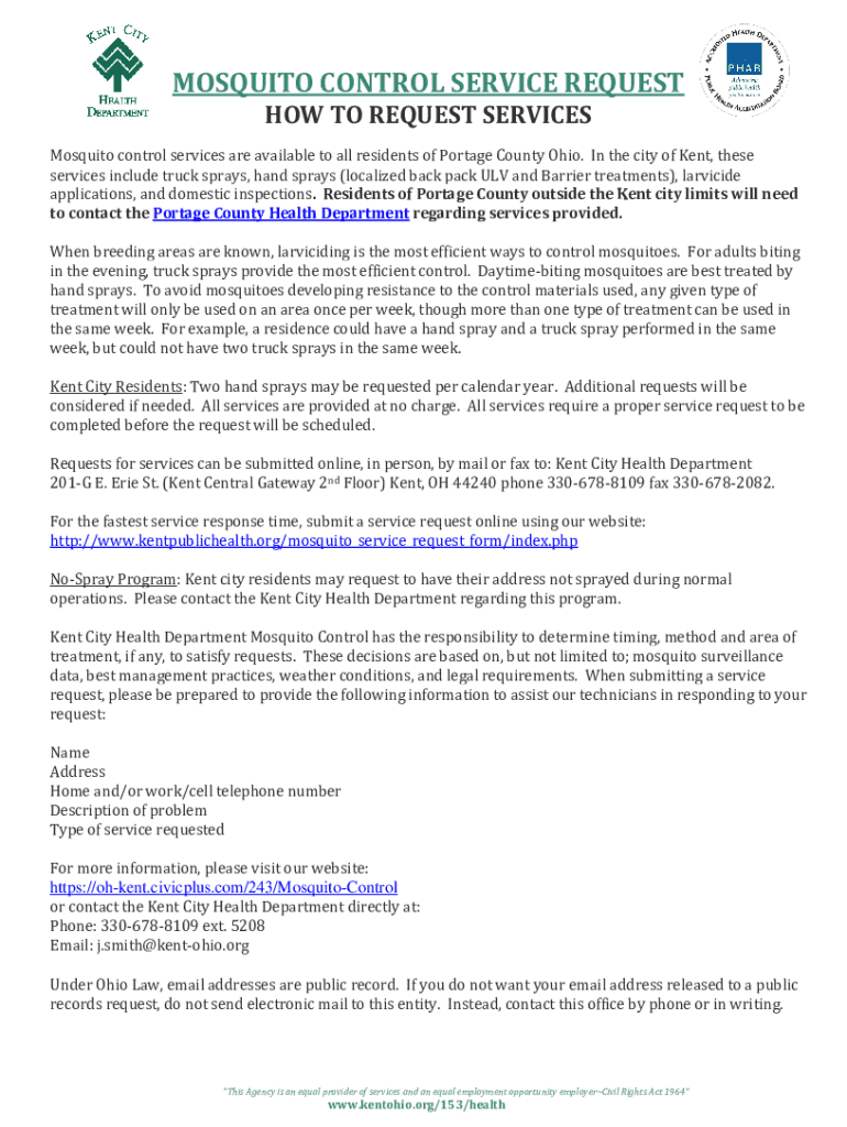 To fill out a request for mosquito control serviceskent, individuals can visit the local government website or contact the relevant department by phone.