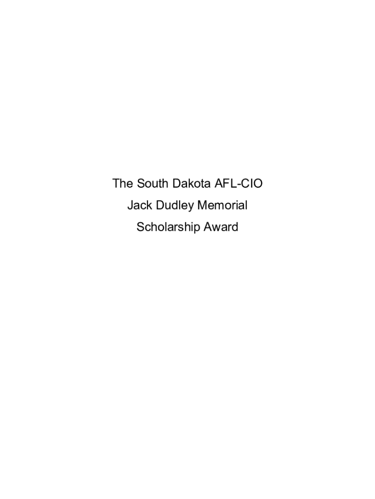 The South Dakota AFL CIO Jack Dudley Memorial Scholarship AwardELIGIBILITY Applicants must be a member in good standing of a union affiliated with South Dakota State Federation of Labor, AFL CIO,