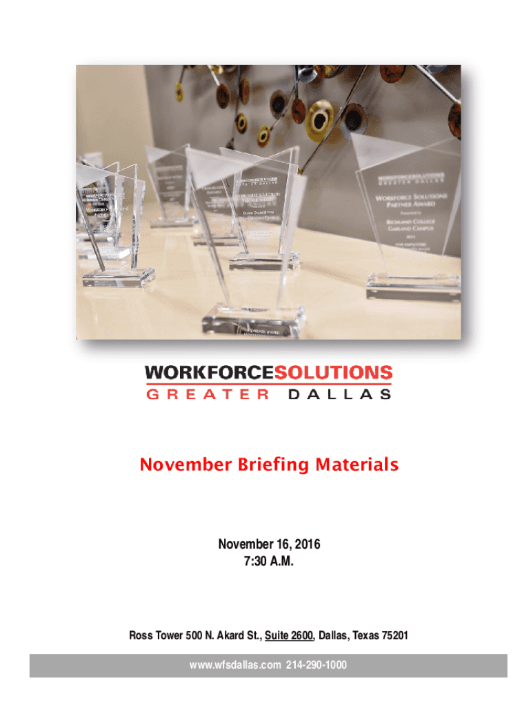 November Briefing Materials November 16, 2016 7:30 A.M. Ross Tower 500 N. Award St., Suite 2600, Dallas, Texas 75201 www.wfsdallas.com 2142901000BOARD OF DIRECTORS MEETING November 16, 2016 7:30 a.m.