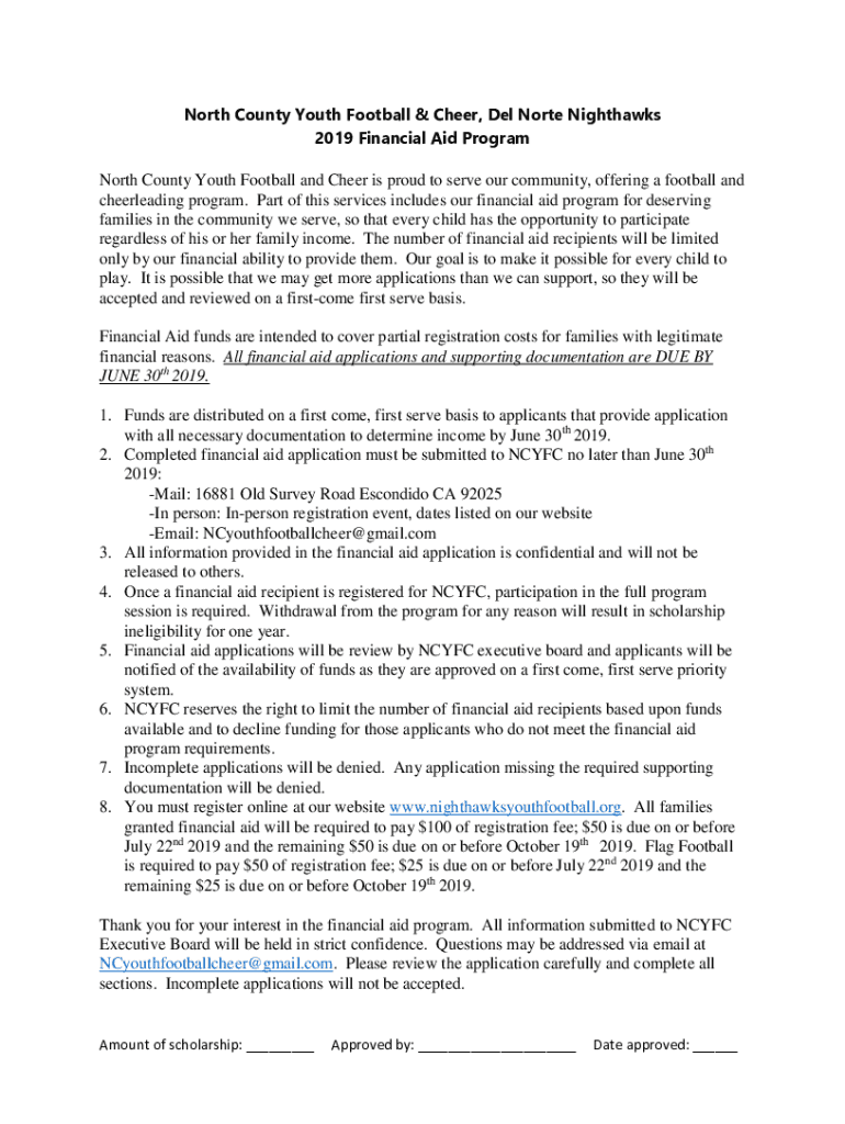 North County Youth Football & Cheer, Del Norte Nighthawks 2019 Financial Aid Program North County Youth Football and Cheer is proud to serve our community, offering a football and cheerleading program.