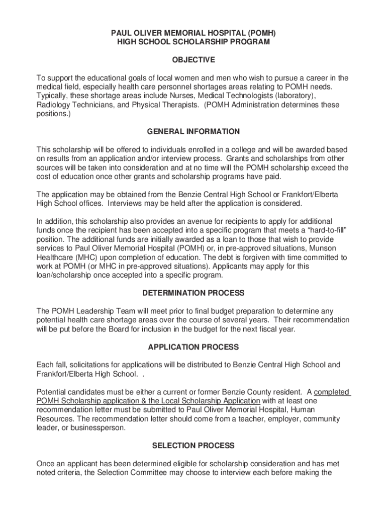 PAUL OLIVER MEMORIAL HOSPITAL (POMP) HIGH SCHOOL SCHOLARSHIP PROGRAM OBJECTIVE To support the educational goals of local women and men who wish to pursue a career in the medical field, especially