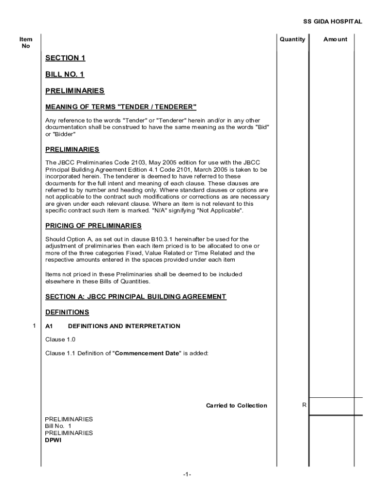 SS GINA HOSPITAL Item NoQuantitySECTION 1 BILL NO. 1 PRELIMINARIES MEANING OF TERMS \” TENDER / TENDERER\” Any reference to the words \” Tender\” or \” Tenderer\” herein and/or in any