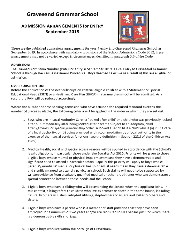 Gravesend Grammar School ADMISSION ARRANGEMENTS for ENTRY September 2019These are the published admissions arrangements for year 7 entry into Gravesend Grammar School in September 2019. In accordance