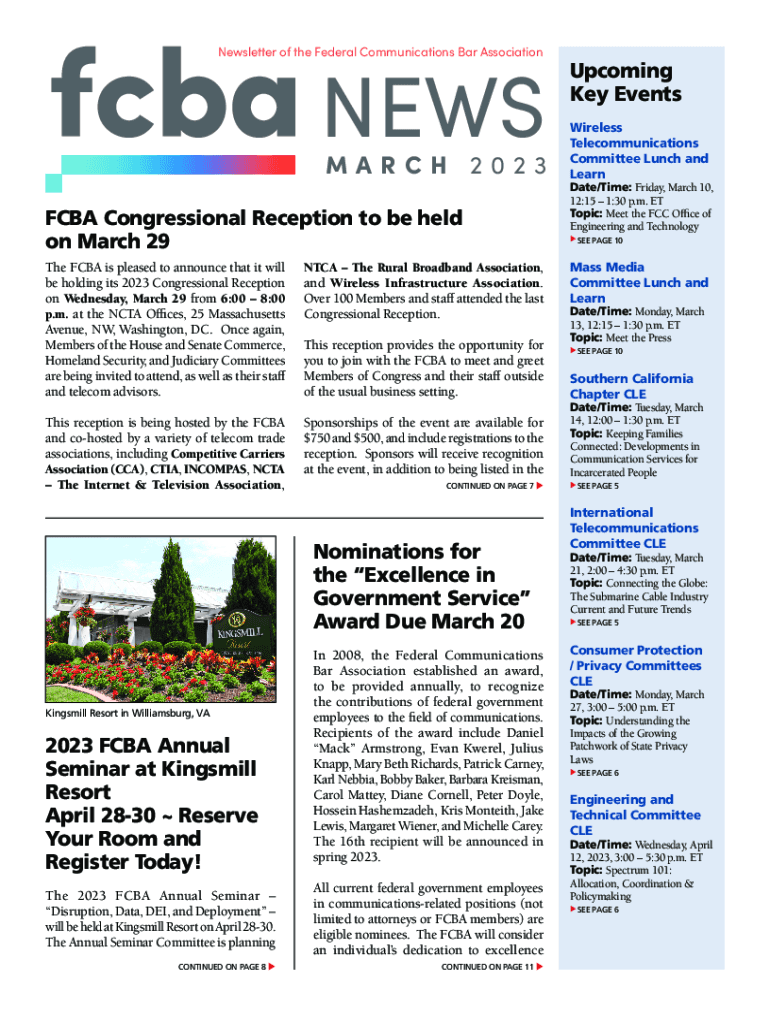 Newsletter of the Federal Communications Bar AssociationNEWSTHE TECH MARCH 2023FCBA Congressional Reception to be held on March 29 The CBA is pleased to announce that it will be holding its 2023 Congressional