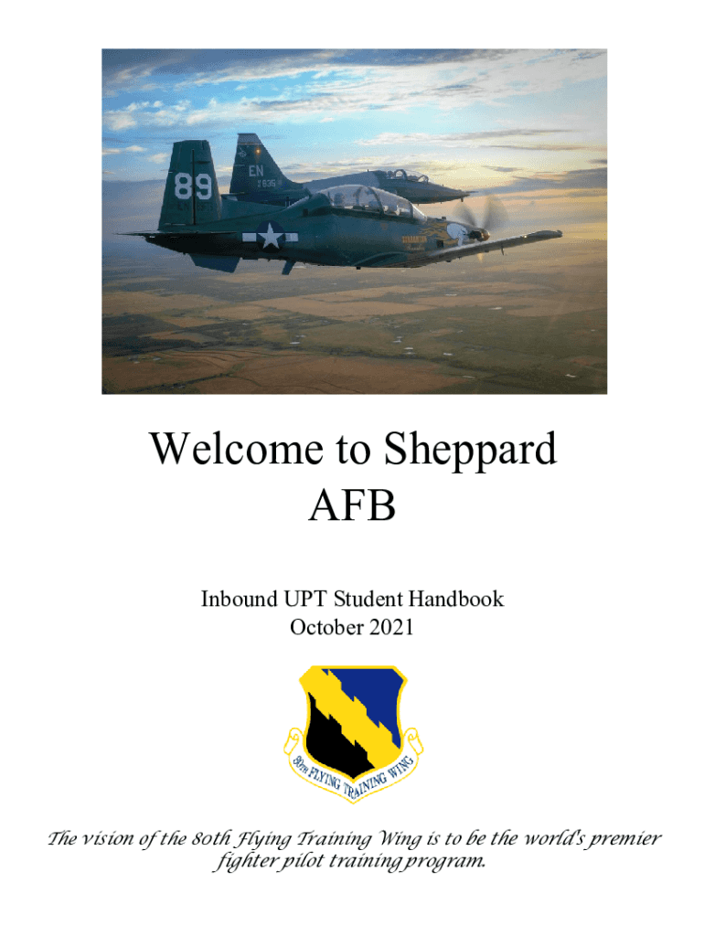 Welcome to Sheppard AFB Inbound UPT Student Handbook October 2021The vision of the 80th Flying Training Wing is to be the world\'s premier fighter pilot training program. TABLE OF CONTENTSEXPECTATIONS