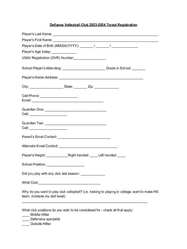 Defiance Volleyball Club 20232024 Tryout Registration Players Last Name: ___ Players First Name: ___ Players Date of Birth (MM/DD/YYY): ___ / ___ / ___ Players Age today: ___ USA Registration (OR)