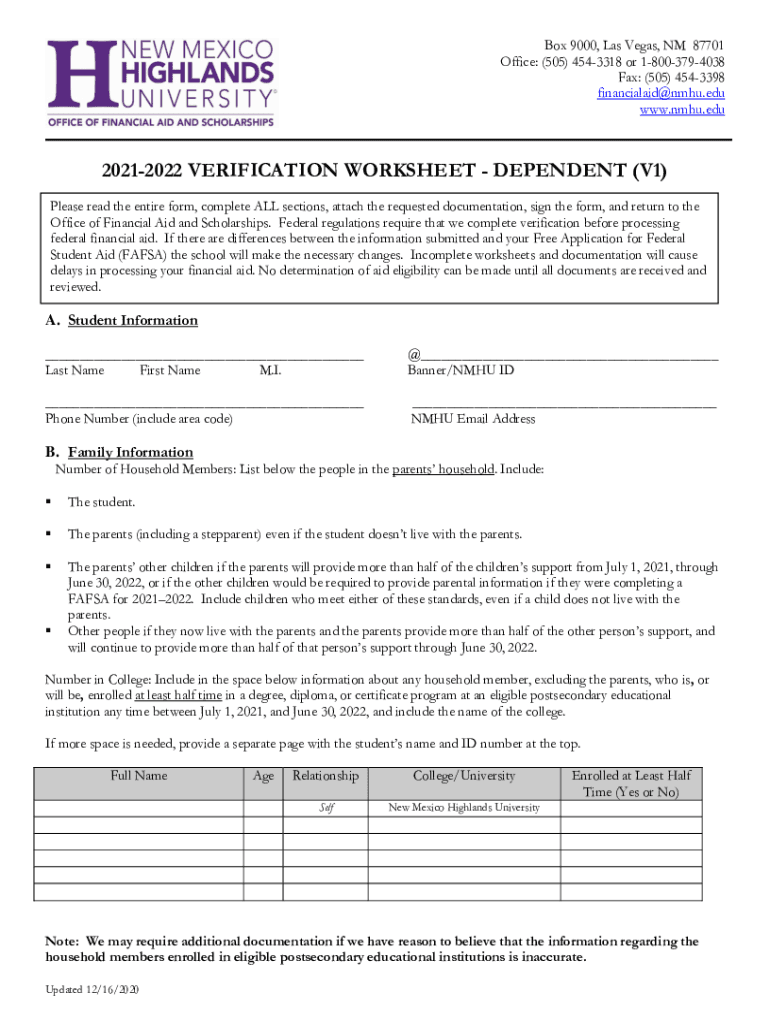 Box 9000, Las Vegas, NM 87701 Office: (505) 4543318 or 18003794038 Fax: (505) 4543398 financialaid@nmhu.edu www.nmhu.edu20212022 VERIFICATION WORKSHEET DEPENDENT (V1) Please read the entire form,