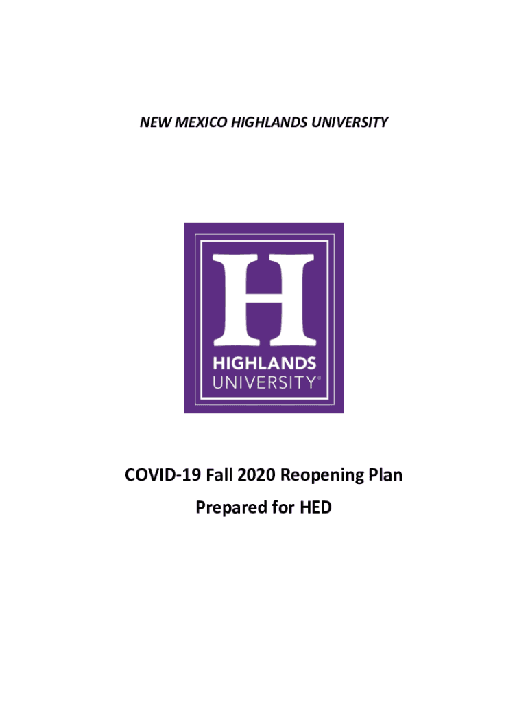 NEW MEXICO HIGHLANDS UNIVERSITYCOVID19 Fall 2020 Reopening Plan Prepared for Heath purpose of this document is to summarize the key strategies and protocols that New Mexico Highlands University (Highlands)