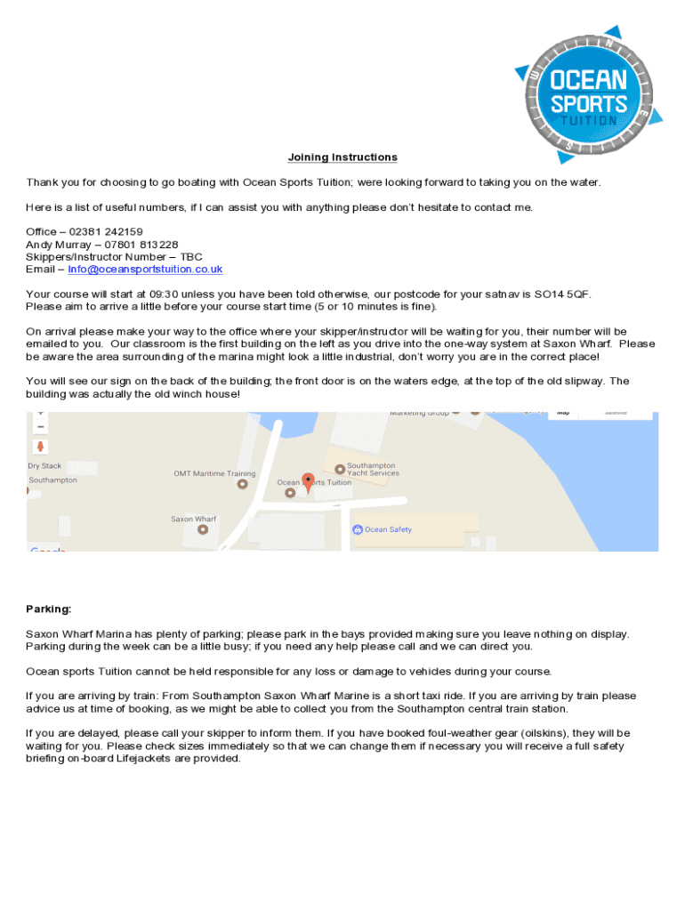 Joining Instructions Thank you for choosing to go boating with Ocean Sports Tuition; were looking forward to taking you on the water. Here is a list of useful numbers, if I can assist you with anything