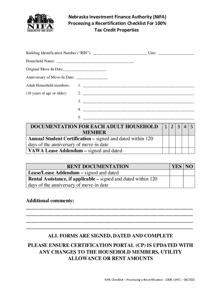 Nebraska Investment Finance Authority (FIFA) Processing a Recertification Checklist For 100% Tax Credit PropertiesBuilding Identification Number (BIN): ___ Unit: ___ Household Name: ___ Original Move