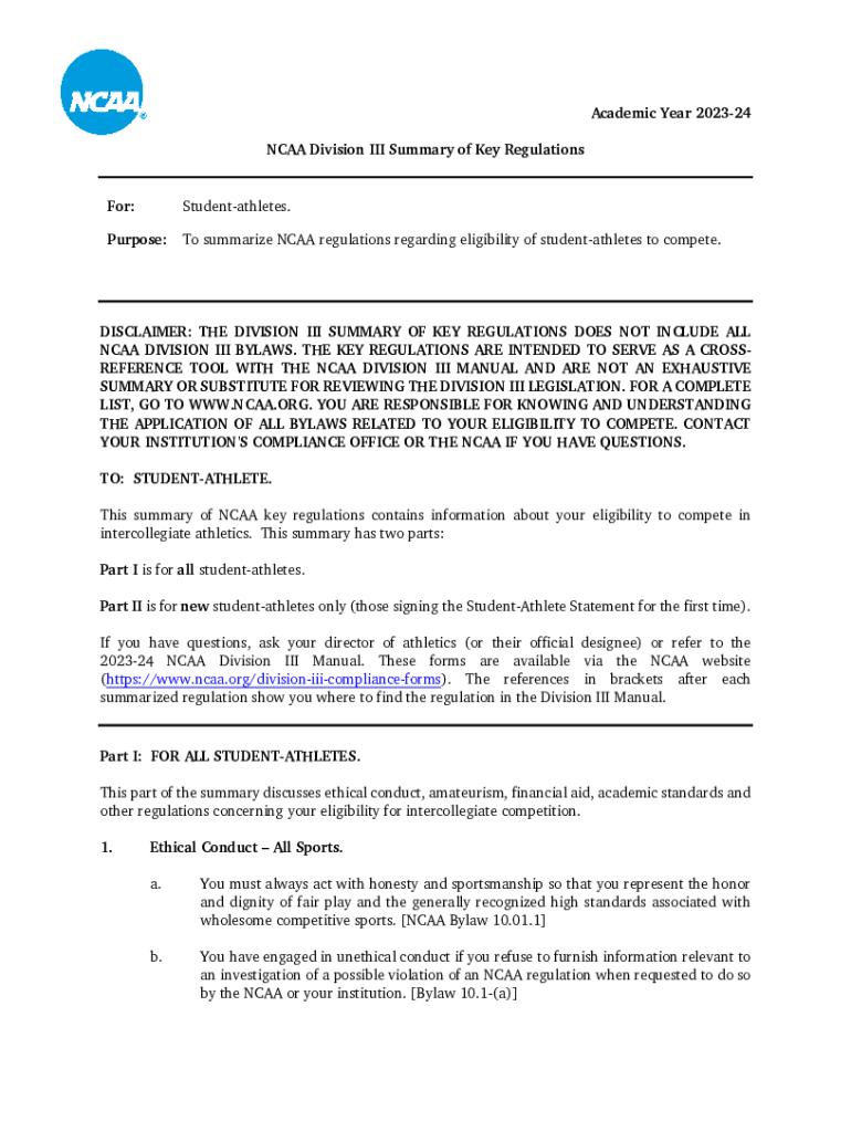 NCAA Division III Summary of Key Regulations:Student athletes. Purpose:To summarize NCAA regulations regarding eligibility of student athletes to compete.DISCLAIMER: THE DIVISION