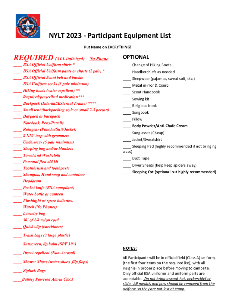 NY LT 2023 Participant Equipment List Put Name on EVERYTHING!REQUIRED (ALL italicized) No PhoneOPTIONAL___ BSA Official Uniform shirts *___ Change of Hiking Boots___ BSA Official Uniform pants or