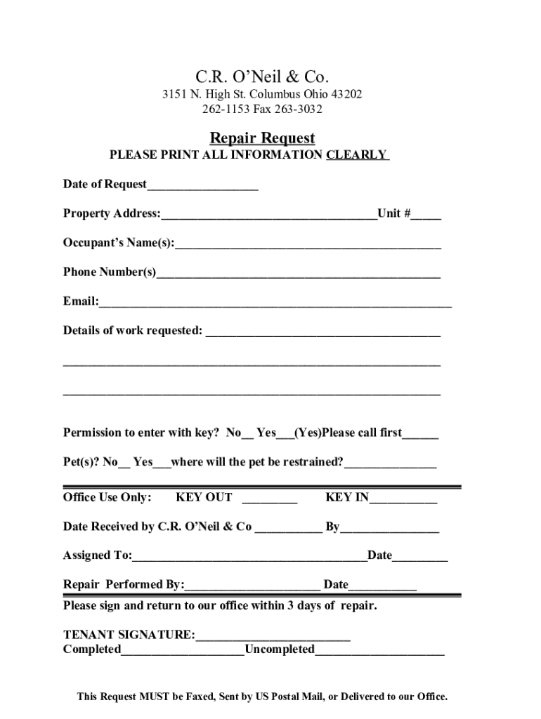 C.R. O'Neil & Co. 3151 N. High St. Columbus Ohio 43202 2621153 Fax 2633032Repair Request PLEASE PRINT ALL INFORMATION CLEARLY Date of Request___ Property Address:___Unit #___ Occupants Name(s):___