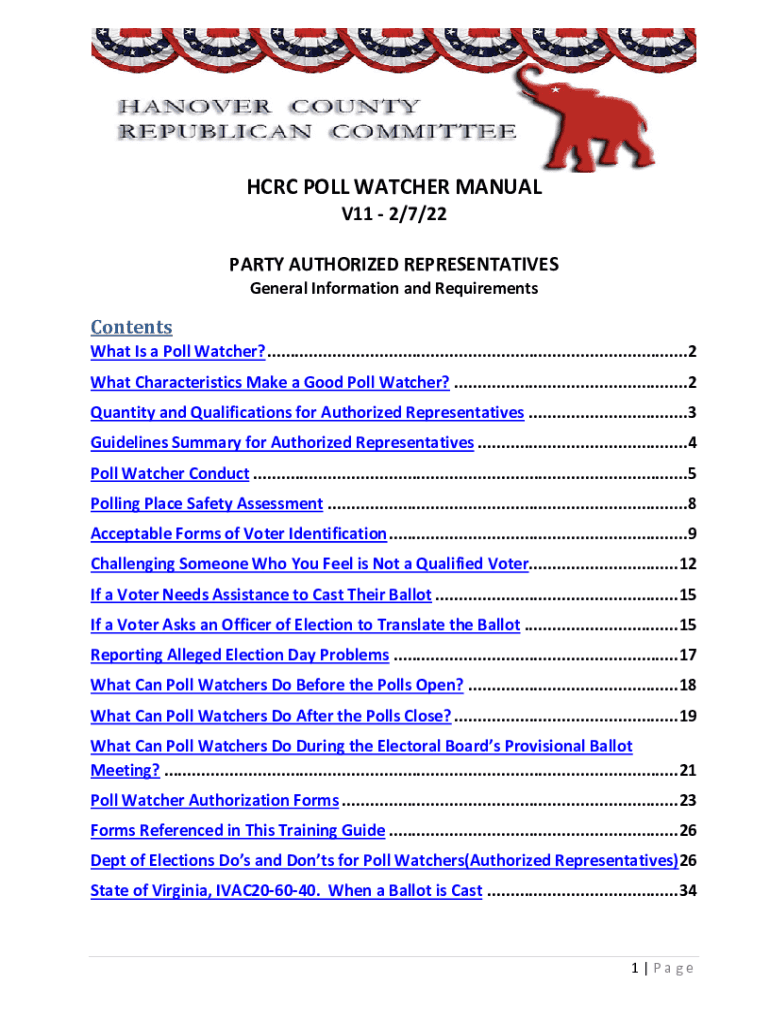 CRC POLL WATCHER MANUAL V11 2/7/22PARTY AUTHORIZED REPRESENTATIVES General Information and RequirementsContentsWhat Is a Poll Watcher? ..........................................................................................2