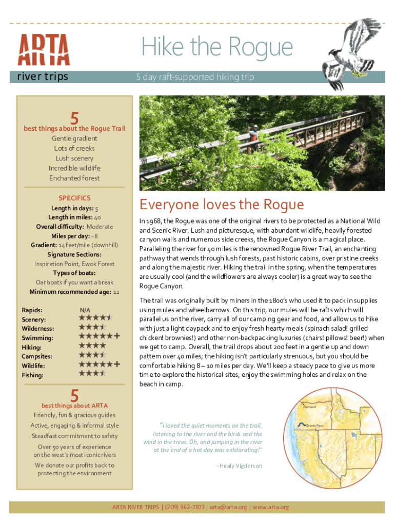 Hike the Rogue river trips5 day raft supported hiking trip5best things about the Rogue Trail Gentle gradient Lots of creeks Lush scenery Incredible wildlife Enchanted forest SPECIFICS Length in days: