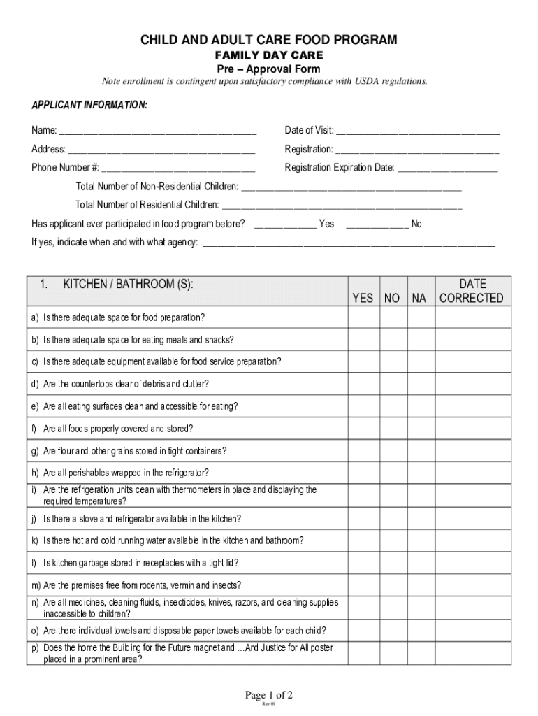 CHILD AND ADULT CARE FOOD PROGRAM FAMILY DAY CARE PRE Approval Form Note enrollment is contingent upon satisfactory compliance with USDA regulations. APPLICANT INFORMATION: Name: ___Date of Visit: