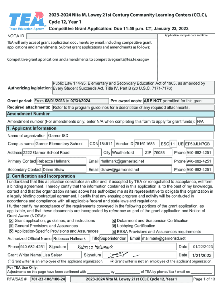20232024 Nita M. Lower 21st Century Community Learning Centers (CCC), Cycle 12, Year 1 Competitive Grant Application: Due 11:59 p.m. CT, January 23, 2023, NOVA Application stamping date and time will