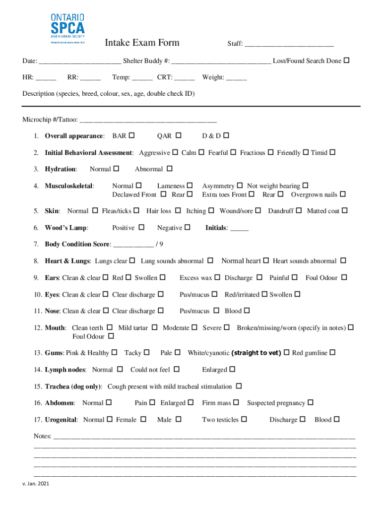 Intake Exam Forestall: ___Date: ___ Shelter Buddy #: ___ Lost/Found Search Done HR: ___RR: ___Temp: ___ CRT: ___Weight: ___Description (species, breed, color, sex, age, double check ID)Microchip #/Tattoo:
