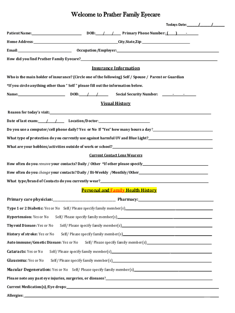 Welcome to Rather Family Eyewear Today's Date:___/___/___ Patient Name:___ Home Address:___ ___ Email:___DOB:___/___/___ Primary Phone Number:_(___)______ ___ City, State, Zip: ___Occupation/Employer:___