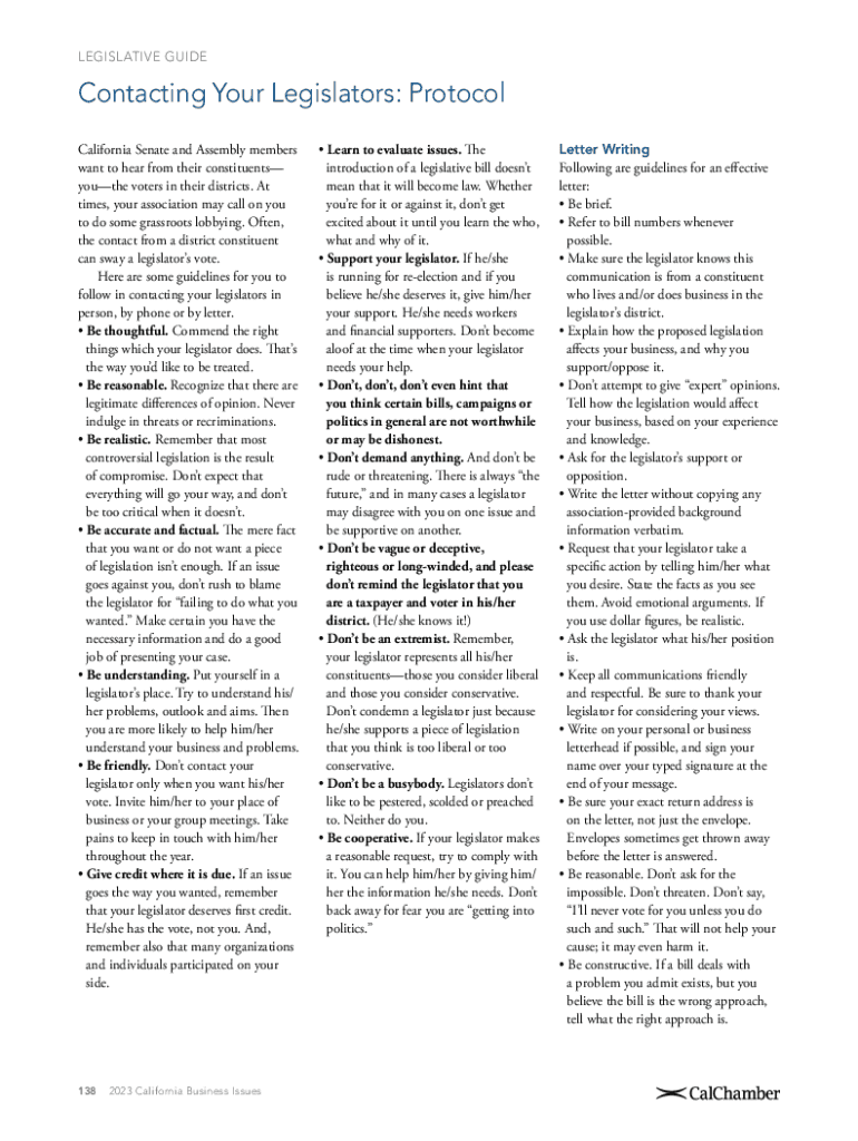 LEGISLATIVE GUIDEContacting Your Legislators: Protocol California Senate and Assembly members want to hear from their constituents youth voters in their districts. At times, your association may call