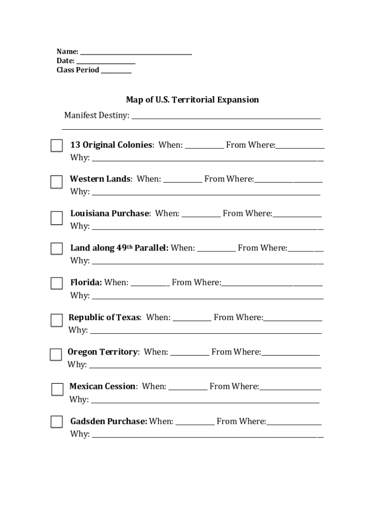 Name: ___ Date: ___ Class Period ___Map of U.S. Territorial Expansion Manifest Destiny: ___ ___ 13 Original Colonies: When: ___ From Where:___ Why: ___ Western Lands: When: ___ From Where:___ Why: