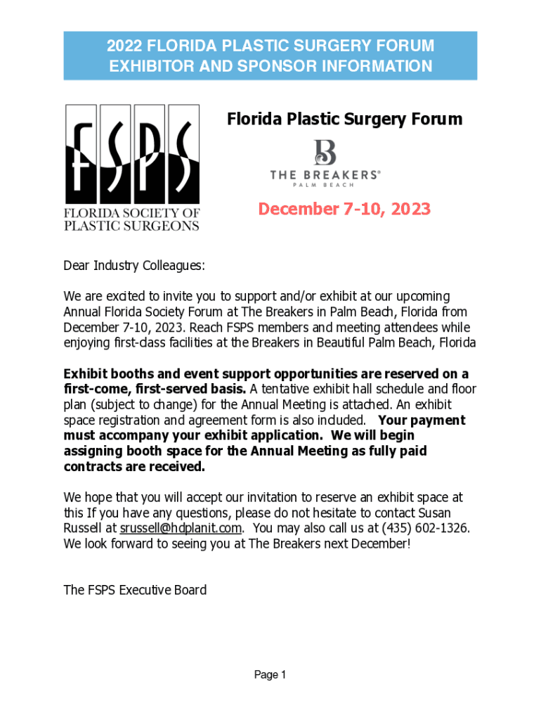 Florida Plastic Surgery Forum December 710, 2023 Dear Industry Colleagues: We are excited to invite you to support and/or exhibit at our upcoming Annual Florida Society Forum at The Breakers in Palm
