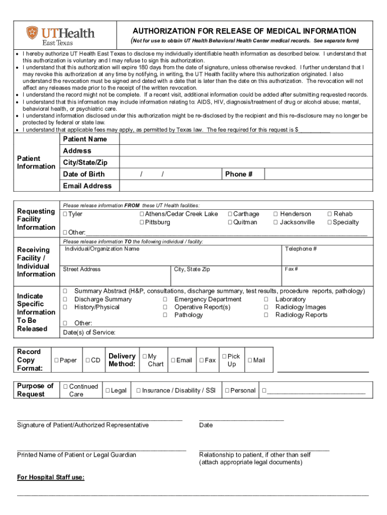 AUTHORIZATION FOR RELEASE OF MEDICAL INFORMATION (Not for used to obtain UT Health Behavioral Health Center medical records. See separate form) I hereby authorize UT Health East Texas to disclose