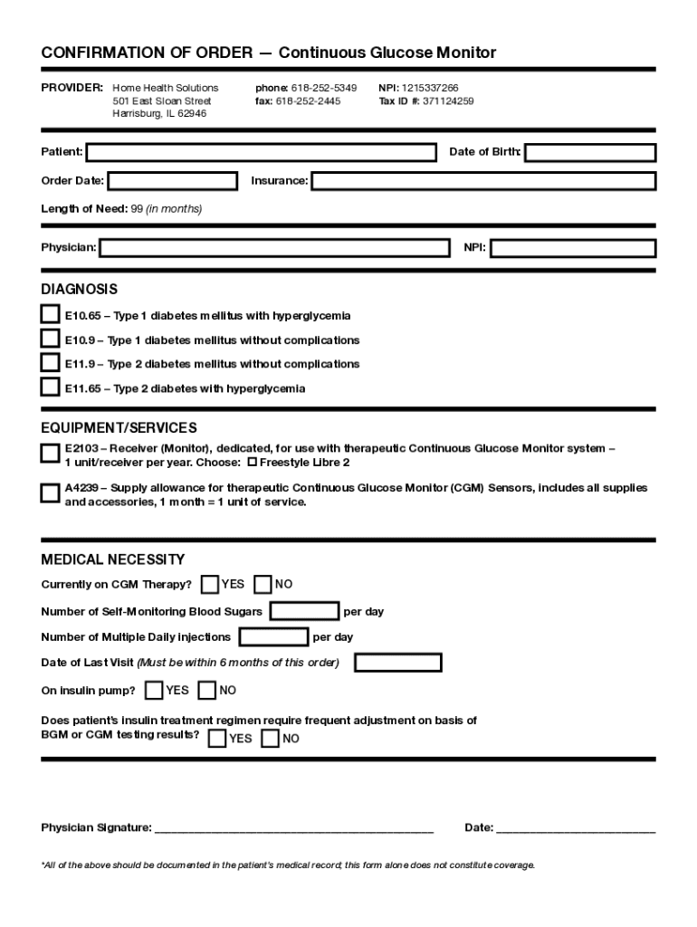 CONFIRMATION OF ORDER Continuous Glucose Monitor PROVIDER: Home Health Solutions phone: 6182525349 fax: 6182522445501 East Sloan Street Harrisburg, IL 62946NPI: 1215337266 Tax ID #: 371124259Patient:Date