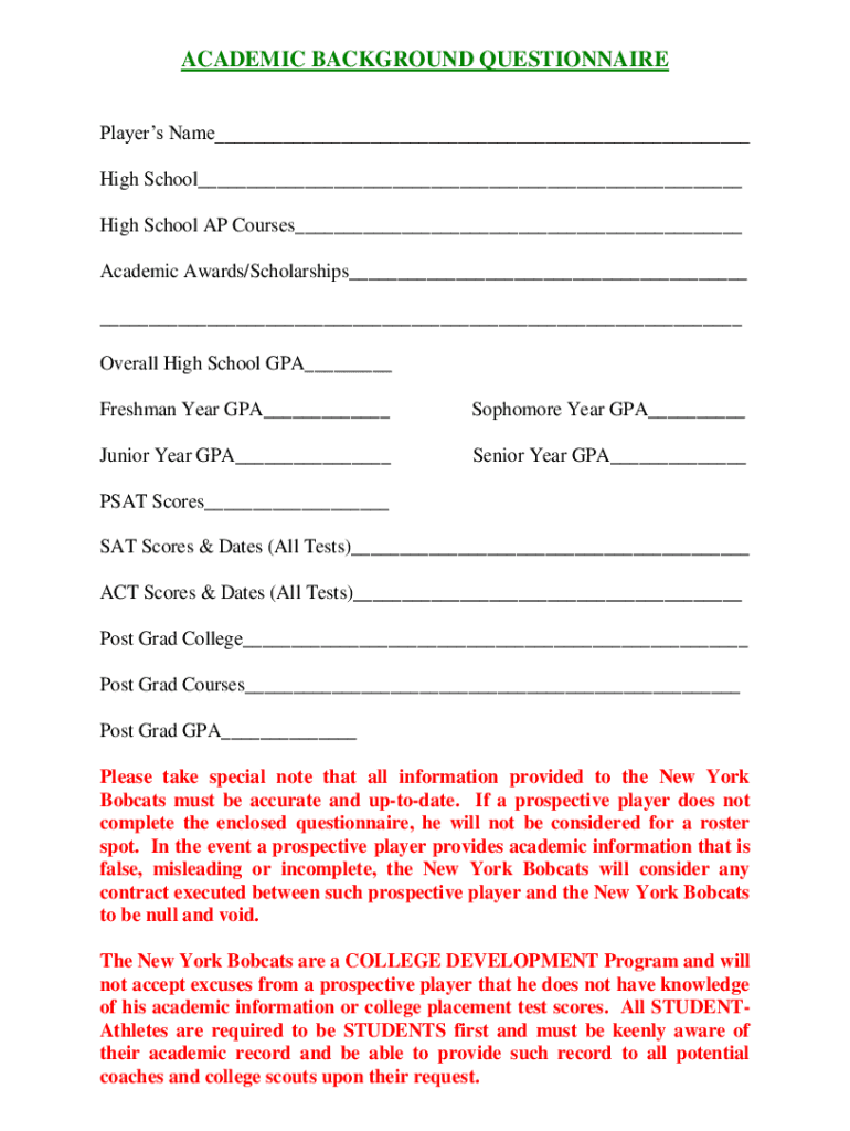 ACADEMIC BACKGROUND QUESTIONNAIRE Players Name___ High School___ High School AP Courses___ Academic Awards/Scholarships___ ___ Overall High School GPA___ Freshman Year GPA___Sophomore Year GPA___Junior