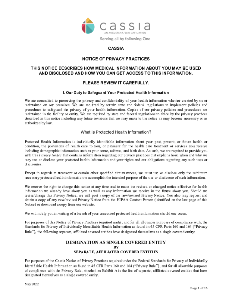 CASSIA NOTICE OF PRIVACY PRACTICES THIS NOTICE DESCRIBES HOW MEDICAL INFORMATION ABOUT YOU MAY BE USED AND DISCLOSED AND HOW YOU CAN GET ACCESS TO THIS INFORMATION. PLEASE REVIEW IT CAREFULLY. I.