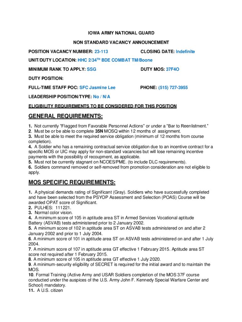 POSITION VACANCY NUMBER: 23113CLOSING DATE: Indefinite UNIT/DUTY LOCATION: HOC 2/34TH BDE COMBAT TM/Boone