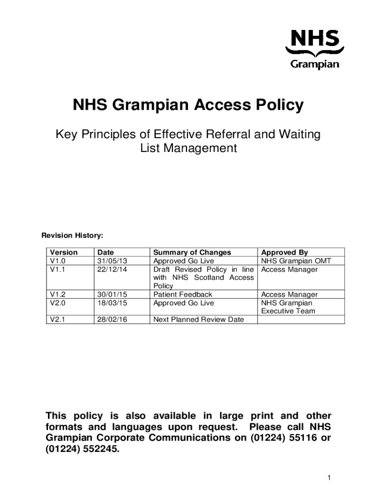 NHS Grampians Access Policy Key Principles of Effective Referral and Waiting List ManagementRevision History: Version V1.0 V1.1Date 31/05/13 22/12/14V1.2 V2.030/01/15 18/03/15Summary of Changes Approved