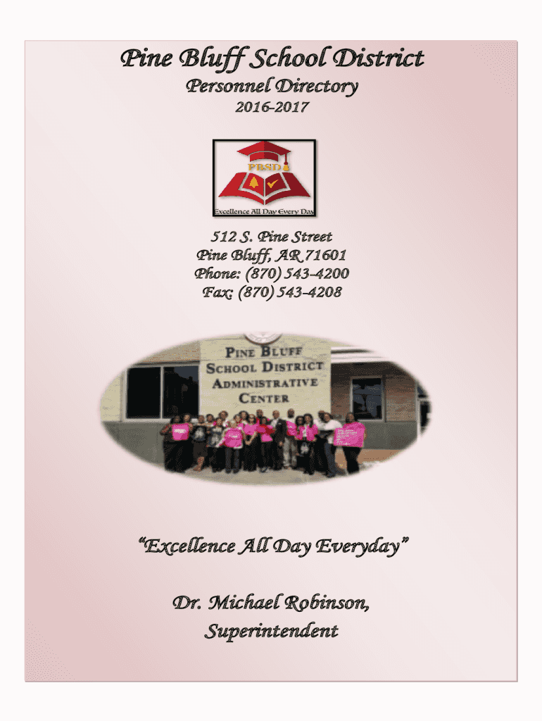 Pine Bluff School District Personnel Directory 20162017512 S. Pine Street Pine Bluff, AR 71601 Phone: (870) 5434200 Fax: (870) 5434208Excellence All Day Every day Dr. Michael Robinson, SuperintendentMission
