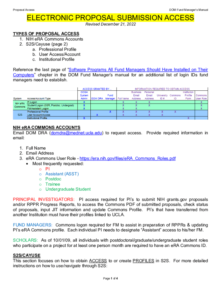 Proposal Access DOM Fund Managers ManualELECTRONIC PROPOSAL SUBMISSION ACCESS Revised December 21, 2022TYPES OF PROPOSAL ACCESS 1. NIH era Commons Accounts 2. S2S/Cayuse (page 2) a. Professional Profile