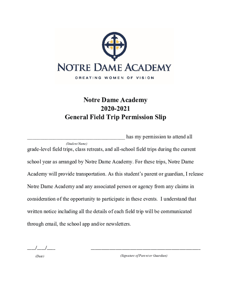 Get the free Notre Dame Academy 2020-2021 General Field Trip ...